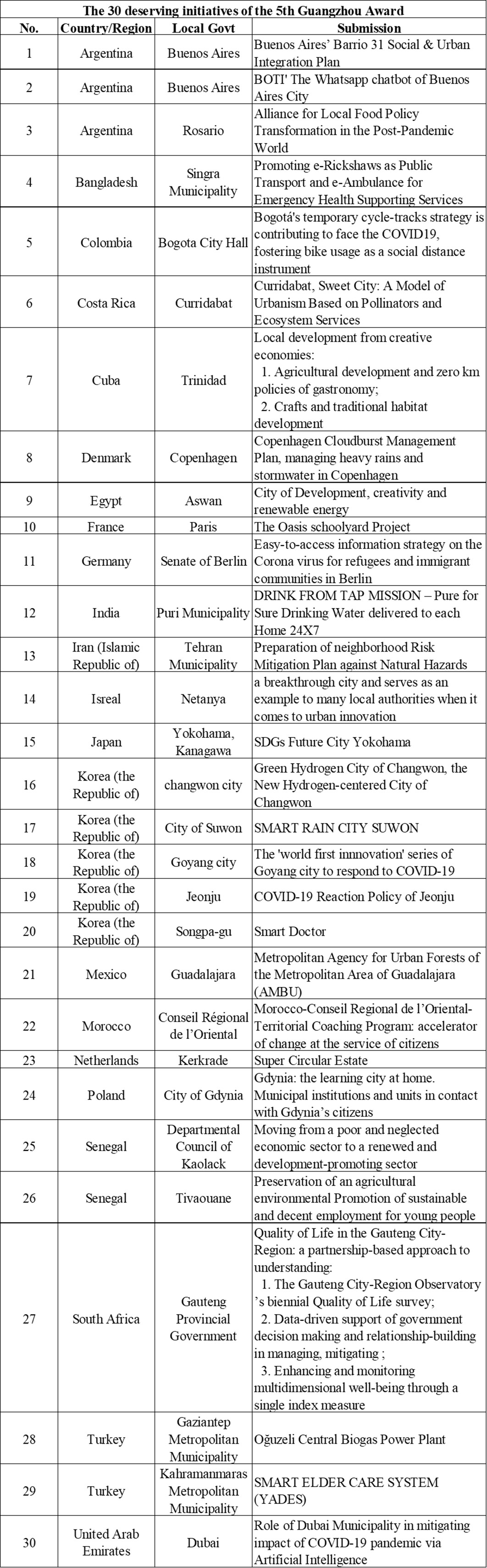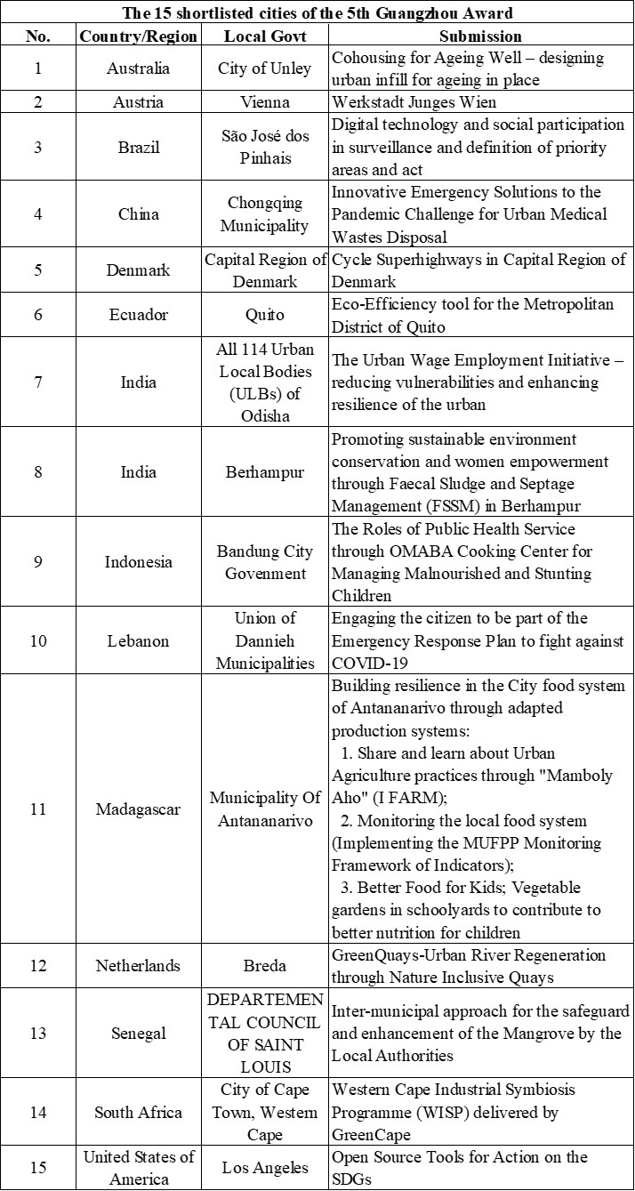 The 2020 Guangzhou Award received 273 initiatives submitted from 175 cities and from 60 countries and territories, among which 239 submitted from 158 cities and from 55 countries and territories were considered valid. The TC would like to recognize all submissions for their commendable efforts in making their respective communities more sustainable. Of these 158 cities, 45 were identified as deserving cities. Of these 45 cities, the TC further shortlisted 15 cities representing outstanding initiatives from the 45. These 15 cities are presented in Annex I, including the reasons behind the TC’s choice.