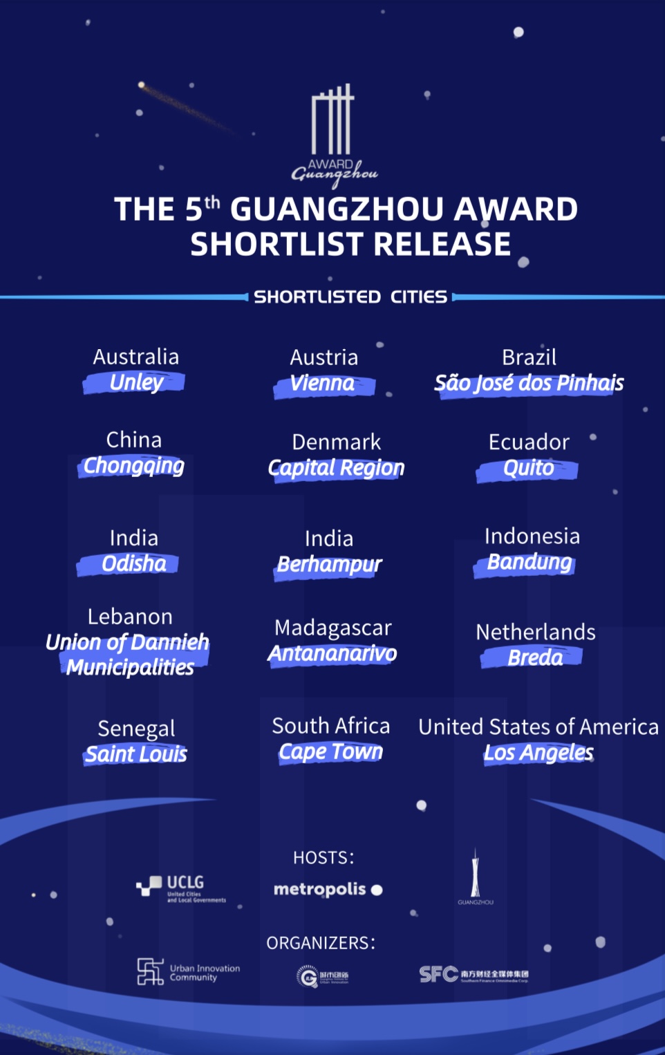 The 15 shortlisted cities of the 5th Guangzhou Award are: City of Unley, Australia; Wien, Austria; São José dos Pinhais, Brazil; Chongqing Municipality, China; Capital Region of Denmark, Denmark; Quito, Ecuador; All 114 Urban Local Bodies (ULBs) of Odisha, India; Berhampur Municipal Corporation (BeMC), India; Bandung City Government, Indonesia; Union of Municipalities, Lebanon; Municipality Of Antananarivo (Commune Urbaine d'Antananarivo, Madagascar; Breda, Netherlands; Departmental Council of Saint Louis, Senegal; City of Cape Town, Western Cape, South Africa; Los Angeles, USA.