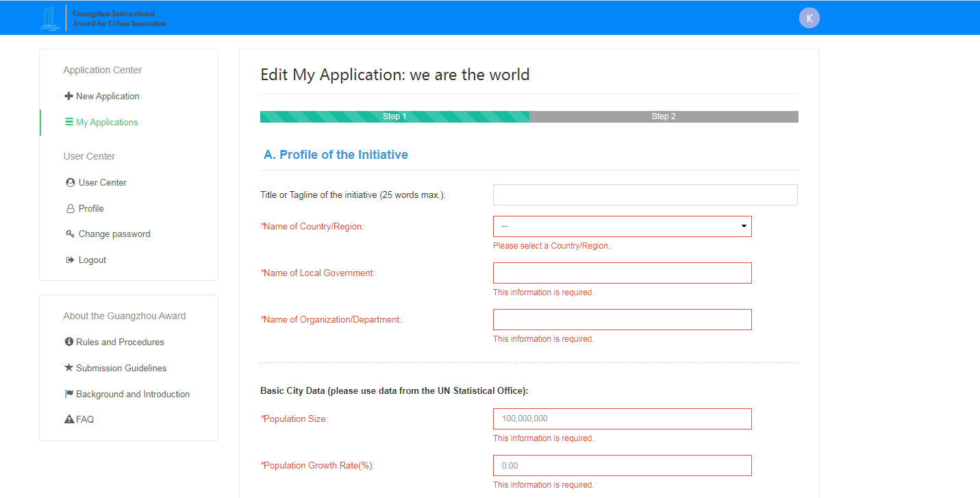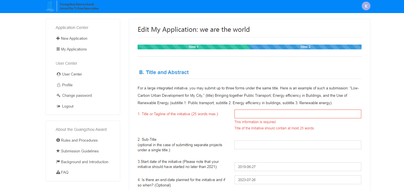 After entering the application form filling page, you need to fill in some basic information (such as initiative name, city basic information, contact information, etc.).