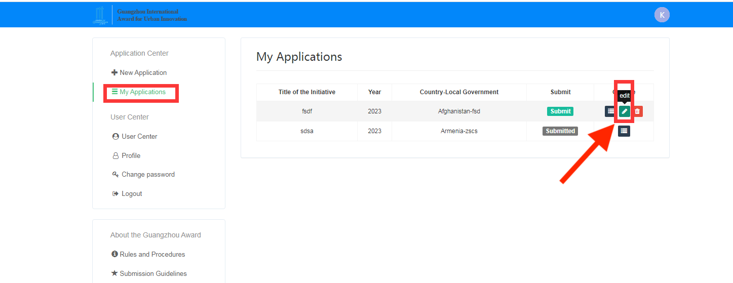 If you exit the page during the filling process, you can view the currently filled application form by clicking the "My Application" button on the system homepage. Clicking the "edit" button of the corresponding application form can enter the editing interface to continue filling or modifying the application form.