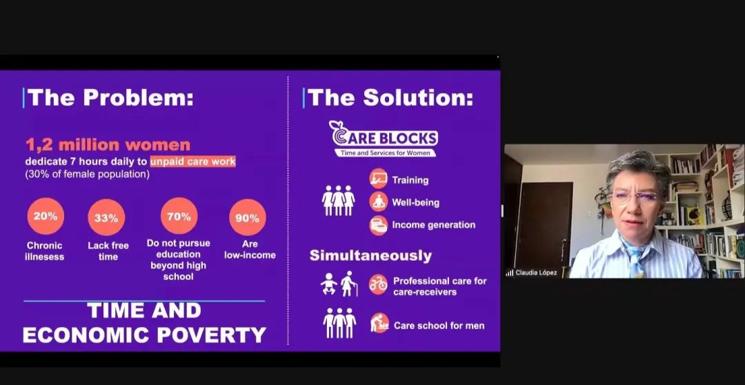 在哥伦比亚首都波哥大,400万女性群体当中有120万女性都在从事着无偿的家务劳动,背负家庭重担的女性无暇自顾,往往缺乏经济自主权与追逐梦想的权利,这是造成性别不平等的结构性原因之一。为了提升关爱女性的能力,波哥大市启动了“关爱系统”项目,“通过重新分配家务劳动、提供家务协助服务、推动男性承担家务劳动等措施,将女性从繁重的家务工作中解放出来,重新获得接受教育、获取收入来源的权利。”波哥大首位女性市长克劳迪娅·洛佩斯介绍道。
