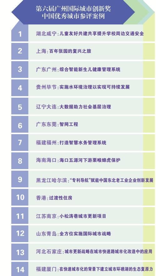 咸宁用“一米高度”用心倾听孩子心声、海口凝聚多方力量“筑巢引凤”、哈尔滨“专利导航”赋能企业创新发展……第六届广州国际城市创新奖(以下简称广州奖)颁奖典礼将于12月7日举行。记者了解到本届广州奖吸引了国内外知名城市报名参评,中国城市方面,共有香港、上海、哈尔滨、大连、青岛、南京、厦门、东莞、咸宁等14个城市报名参评,本届广州奖首次汇编了中国优秀参评案例。