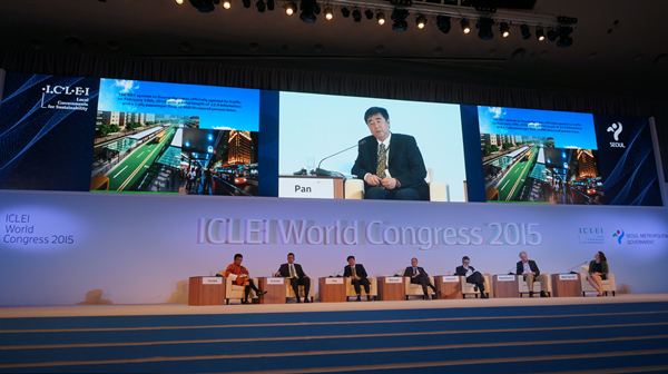 The Guangzhou Municipal Government Delegation, led by Deputy Secretary General Pan An, joined over 2,500 participants at ICLEI World Congress 2015 in Seoul from April 10 to 11, at the warm invitation extended by the event organizers ICLEI and Seoul Metropolitan Government. During one of the sub-plenaries of the Congress featuring “Leaders for Innovation”, Pan shared with audiences the experiences of tackling traffic congestion by using innovative methods in metropolises such as Guangzhou. “Traffic and transportation are essential public services for a smooth economic development”, Pan said, “Guangzhou has made active efforts in the construction of bus rapid transit system (BRT) and metro lines, as well as water bus systems in dealing with traffic congestion”.