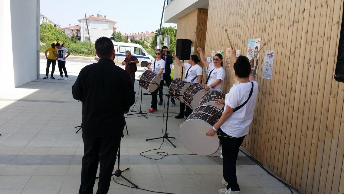文化和社会服务事务主任雷希德·坎敦女士(右三)在吕莱布尔加兹市女子学院召集鼓队成员